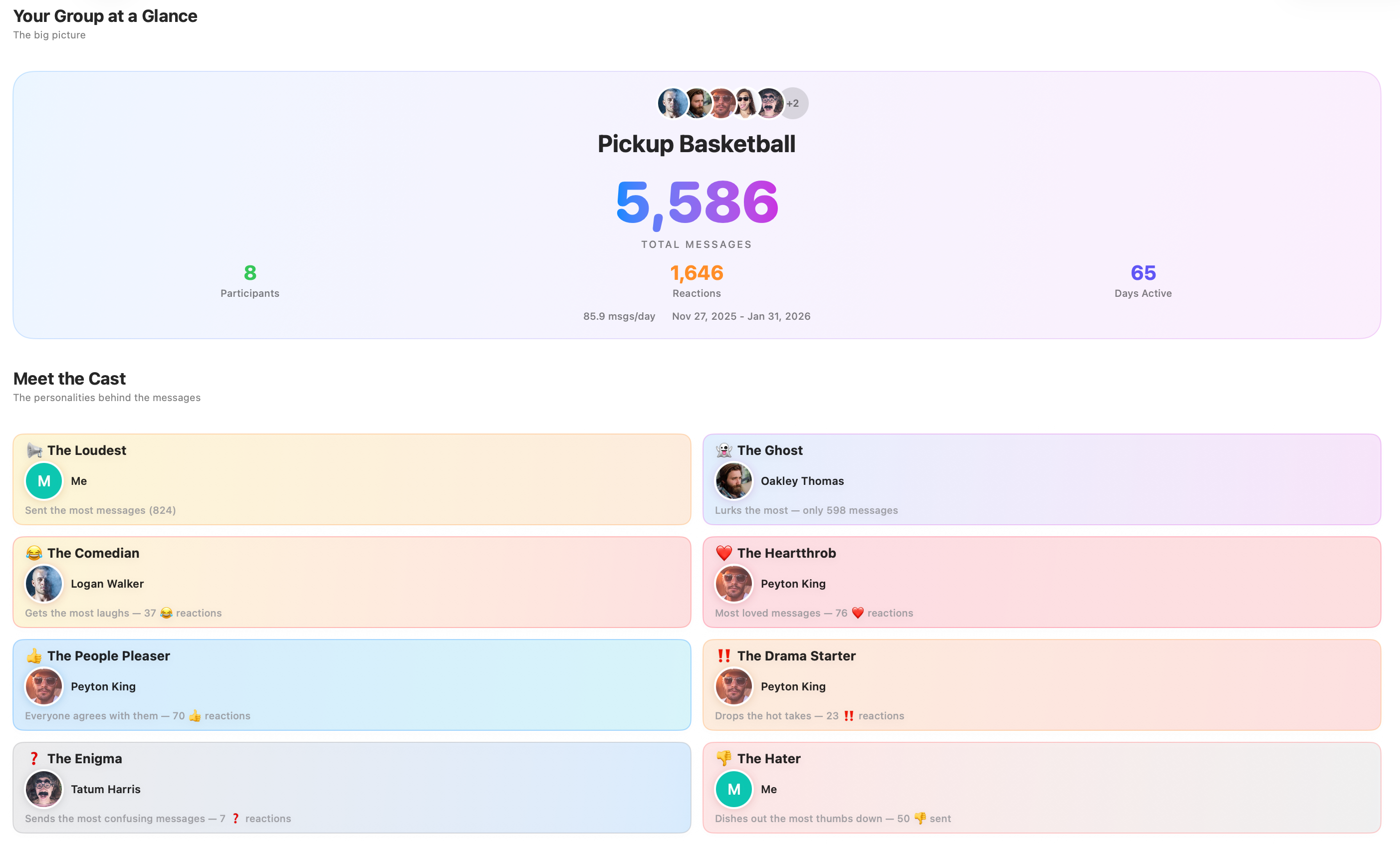 Your iMessage group chats, wrapped. See who texts the most, tapback rankings, perfect scores, and more. All processed locally on your Mac.