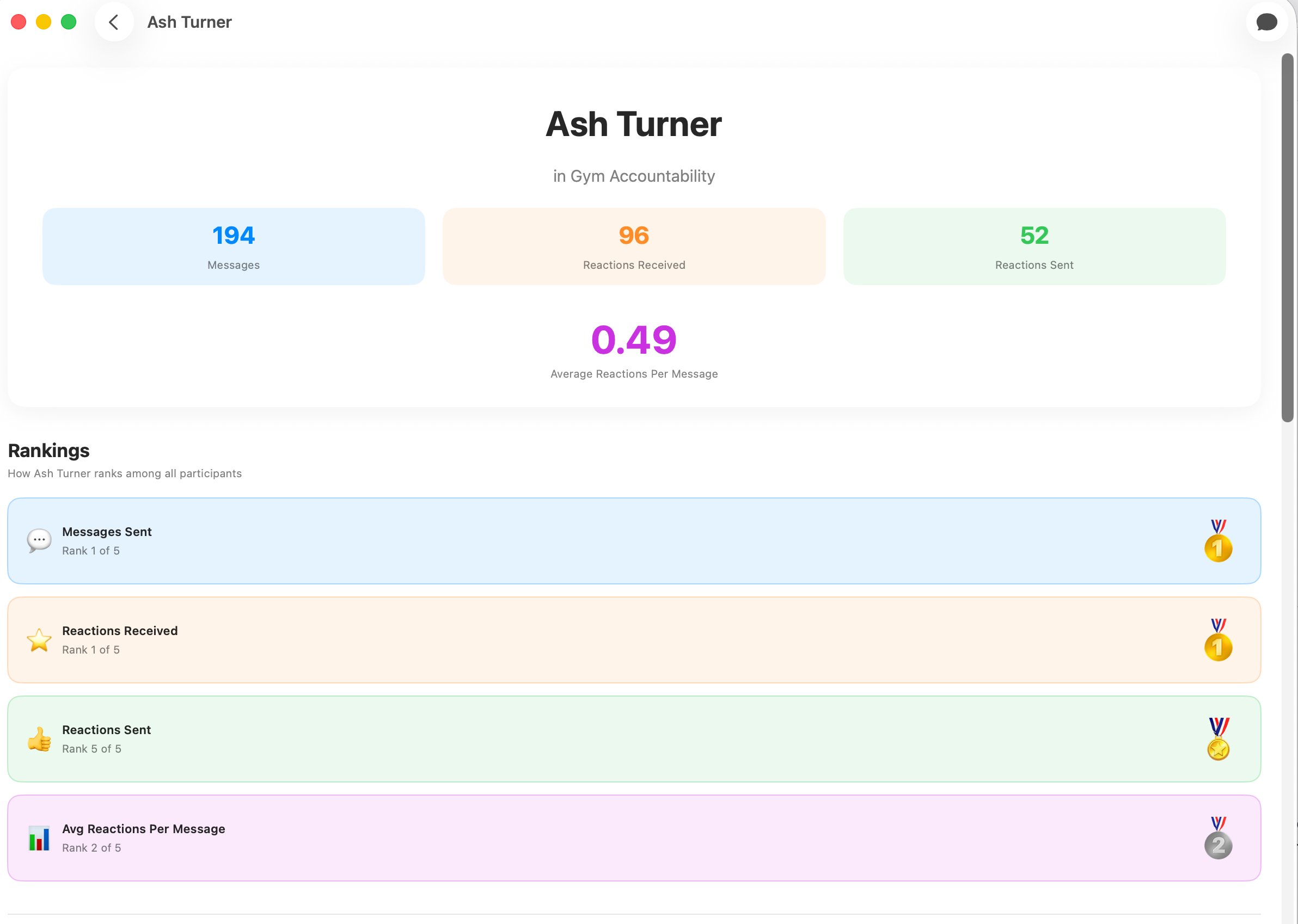 Tap into any member to see their individual stats, rankings, and standout messages.