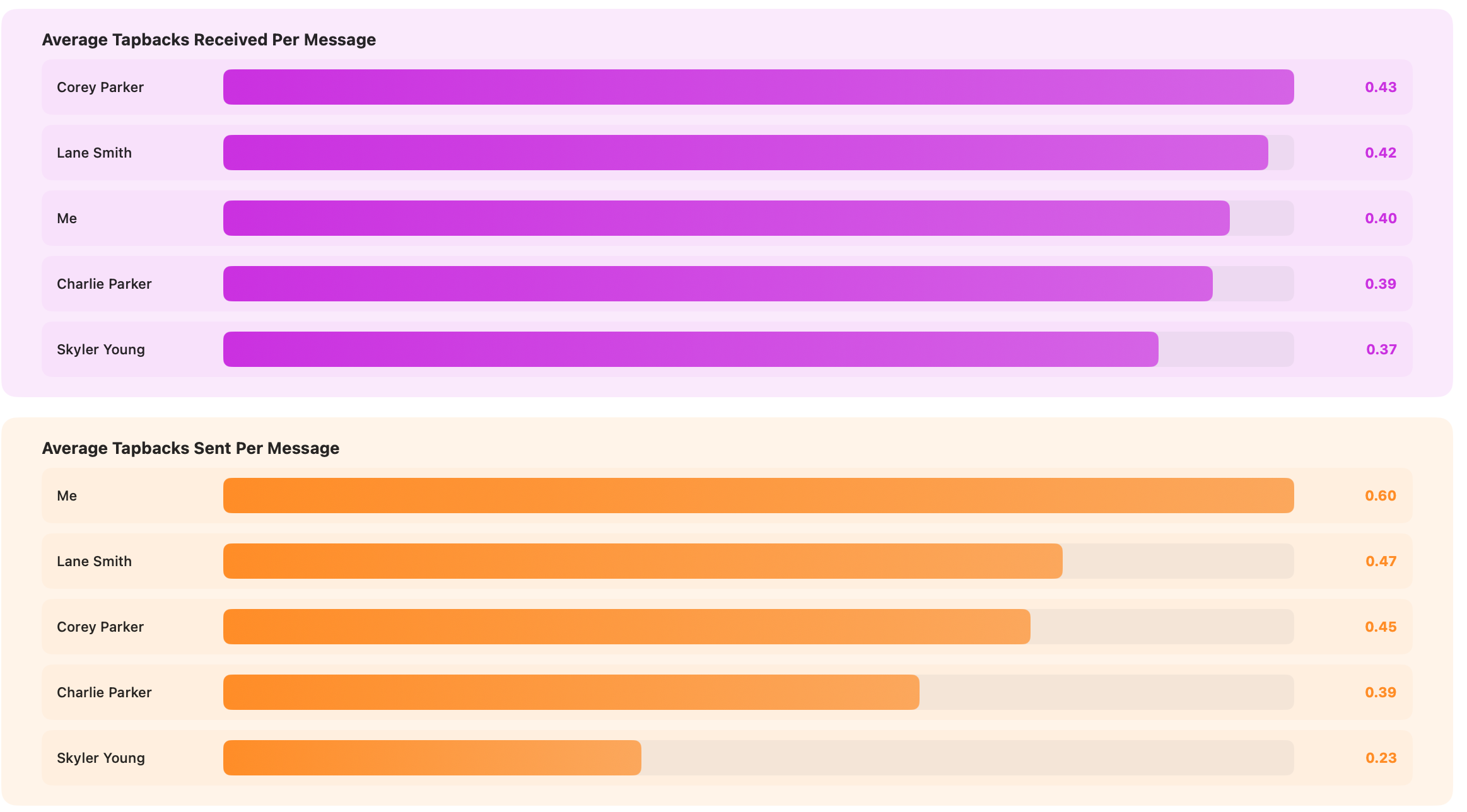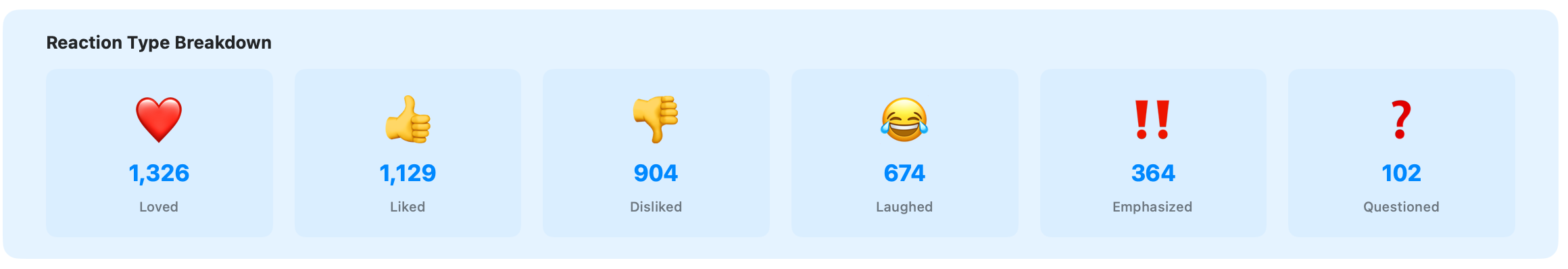 Full breakdown of reactions: who gets the most loves, laughs, likes, and emphatics. See tapbacks sent and received.